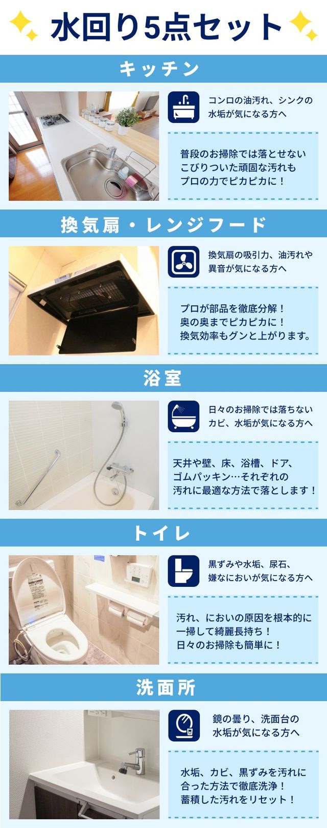 キッチン、換気扇、浴室、トイレ、洗面所をクリーニングします。