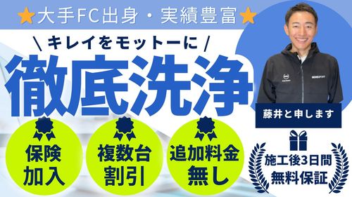 早朝スタートOK, 夜間スタートOK, 追加料金一切なし, 駐車場代無料, 複数予約で割引, 作業外注一切なし, 対応エリア外相談可能, エコ洗剤