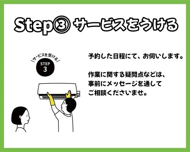 ・お客様ご不在時のサービスは行っておりませんが、作業中の外出は可能です。ただし、作業前と作業後には必ずお立合いをお願いしています。