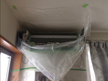 エアコン周囲を養生することで高圧洗浄作業に着手します。