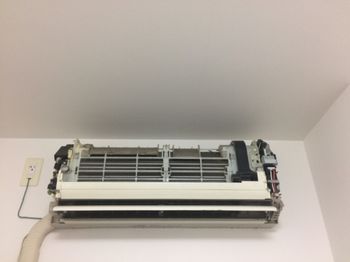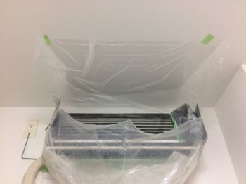 エアコン周囲を養生して防水処置を施し、高圧洗浄作業へ着手します。