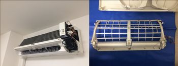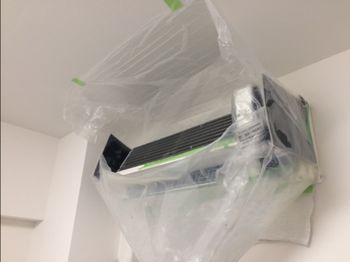周囲を養生して、熱交換器(アルミフィン)・シロッコファンを洗浄します。