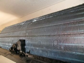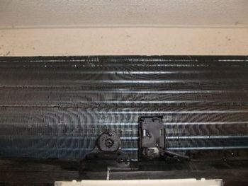 同じエアコンを別角度から。ここまでホコリがビッシリと付いてしまうといくらお掃除機能がフィルターのお掃除をしていても意味がありません。この熱交換器のフィンの隙間に部屋の空気を通したうえで冷やしたり温めたりして冷暖房としての機能を果たしますのでここが詰まっていますと冷暖房の効率が劇的に悪くなり、風も弱くなってしまいます。
