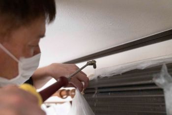 脚立を使い、エアコンの分解したうえでビニールで養生を致します。