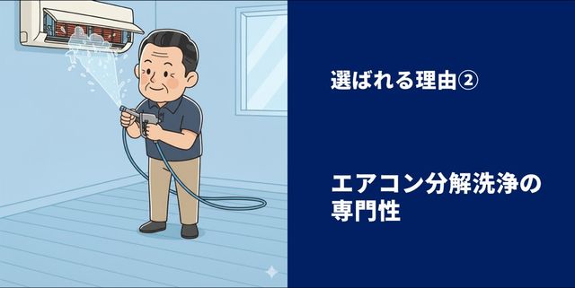 特にエアコン分解洗浄を得意とし、細かな部品まで外して徹底的に洗浄します。