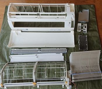 お掃除機能付きエアコンはカバーやルーバー、フィルターの他、お掃除機能ユニット等を取り外してクリーニングします。