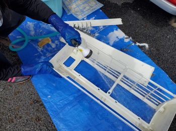 エアコンの外装部分を取り外し、熱交換器とファンが洗浄できる様にします。