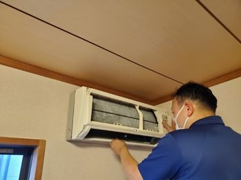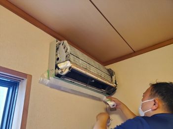 エアコンの周りを養生し、エアコンからの水漏れを防ぎます。