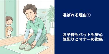 道具の清潔さや置き場所への配慮はもちろん、作業中の音や動線にも気を配り、小さなお子様やペットへの安全対策も社内で徹底。