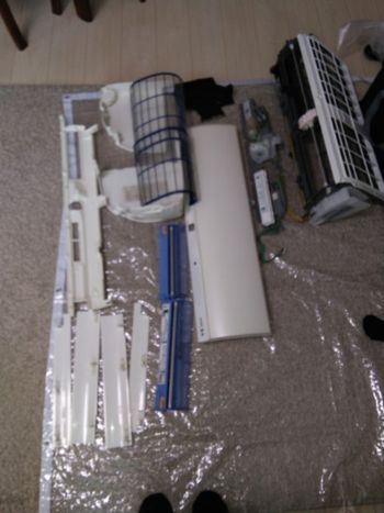 おそうじ機能付きエアコンの分解した各部品です。これらも一つ一つ丁寧にキレイにします。カビ・ホコリが部品に残っていますと、結局広がってしまい洗浄した意味がありません。