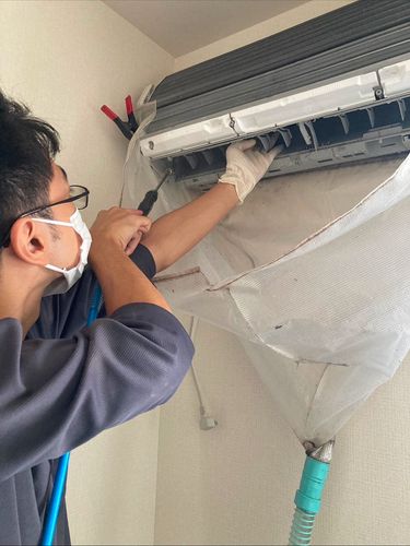 まず、お客様の大切な家具や壁が汚れないよう、エアコンの周囲を専用のシートで丁寧に保護します。