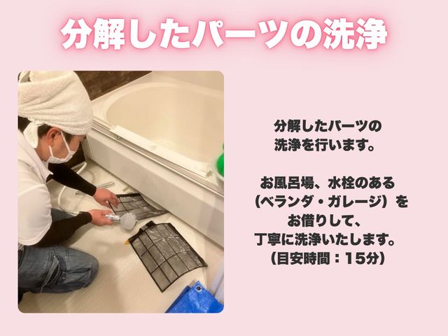エアコンの部品を洗うのに、お風呂場を使っていたたいたのですが、洗浄後には、排水口もキレイにしていただけで、とても助かりました。