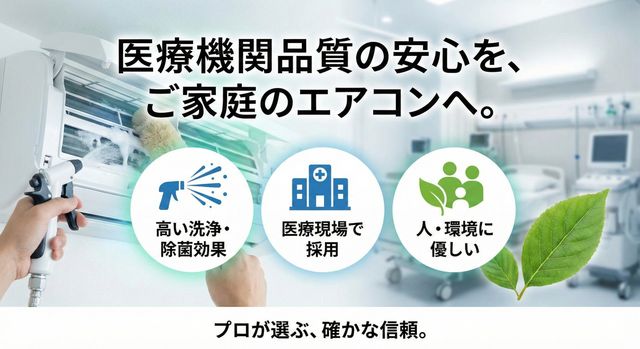 当店では、強力な洗浄力でカビや菌を徹底除去しつつ、赤ちゃんのいるご家庭でも安心してお使いいただけるよう、医療機関向けに開発された安全性の高い洗剤を厳選して採用しています。キレイな空気で、安心の暮らしをお届けします。
