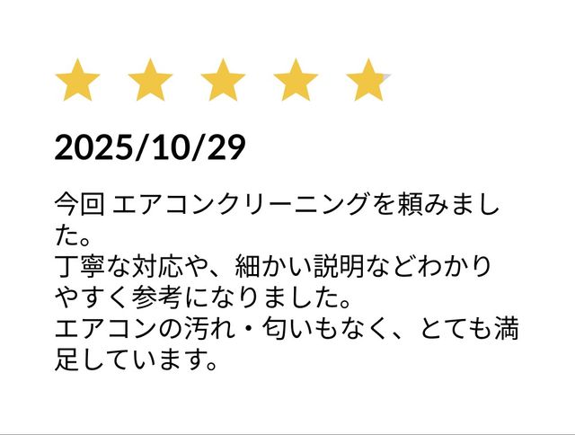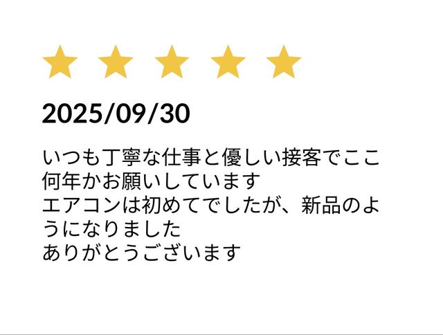 事前に細かい打ち合わせができたので安心してお任せできました。とても気さくで良い方で熱心に作業して下さり、エアコン以外のところも相談に乗ってくださいました。またご縁がありましたらぜひお願いしたいと思います!ありがとうございました。