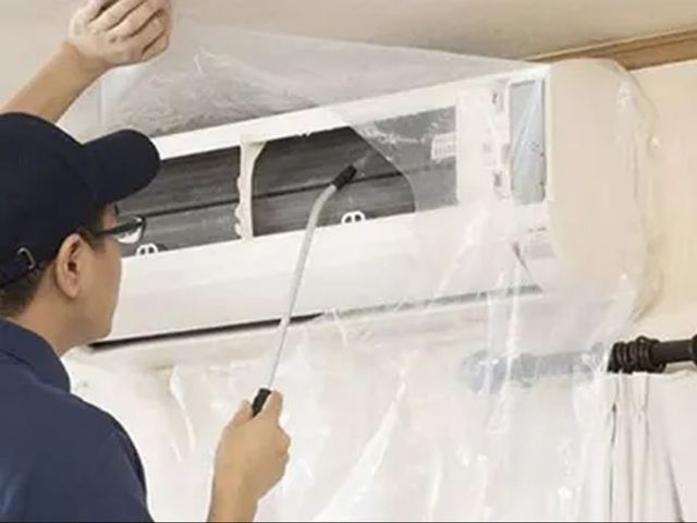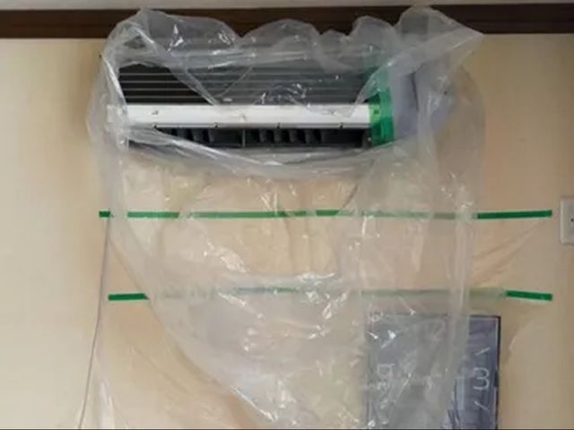 業務用の広めのエアコンカバーをご用意しております。 エアコン本体の高圧洗浄が完了次第、エアコンカバー内部で外に水がかからないようにしながら、その場でパーツ洗浄いたします。