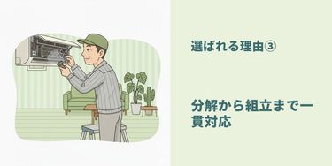 エアコンの構造を熟知しているため、分解・洗浄後の組立や動作確認まで自社で完結。内部の細部まで目が行き届くからこそ、洗浄ムラや故障の心配がありません。仕上げの風量チェックまで丁寧に行います。