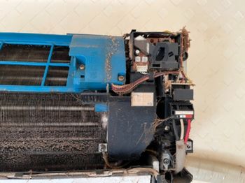 10年間経過したエアコンの内部です。ほこりが大量に付着しております。とくに電源付近のほこりは火災の原因となりますので注意が必要です。