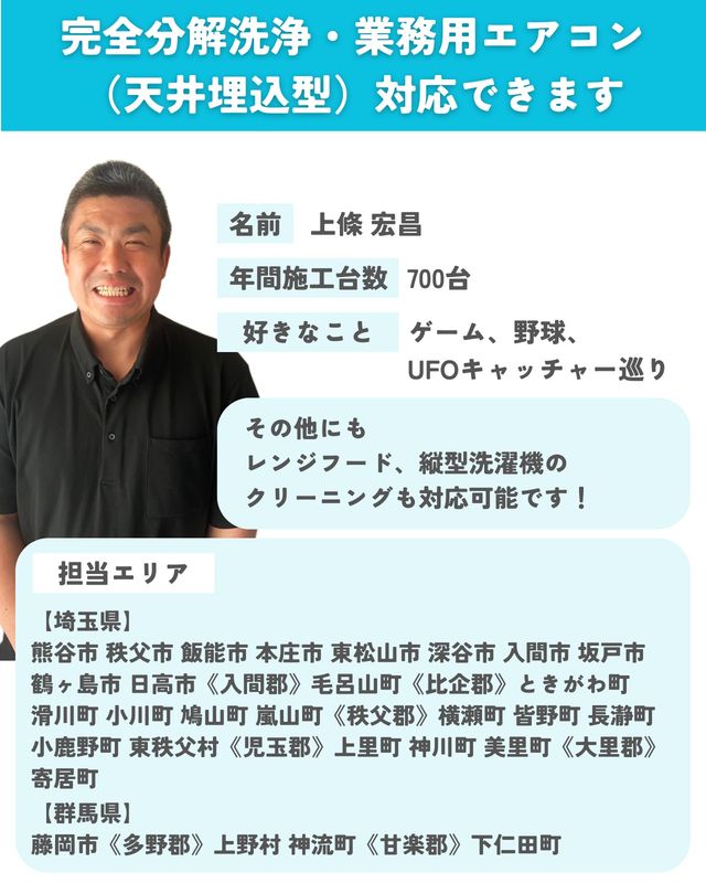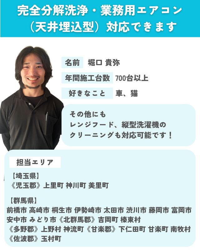 とても丁寧な方に作業していただけました。全ての工程を見ていた訳ではありませんが、本体の洗浄から室外機等の清掃まで、正確にすばやくこなしていらっしゃいました。移動していたテレビ台を元の位置に戻してくださったり、洗浄に使用したお風呂の掃除までと、親切にしてくださいました。またお願いしたいと思います。本当にありがとうございました。