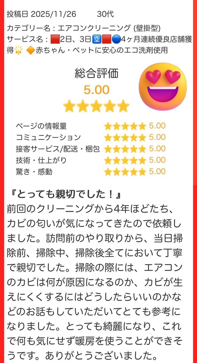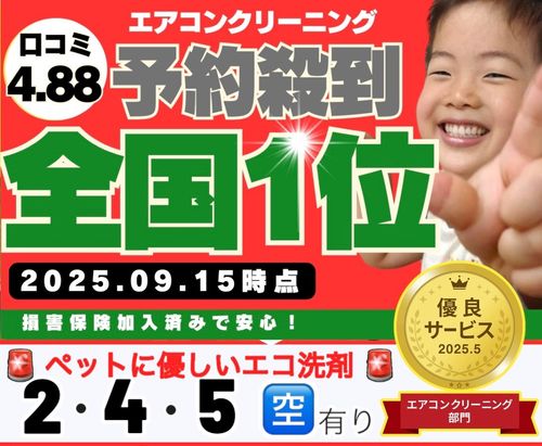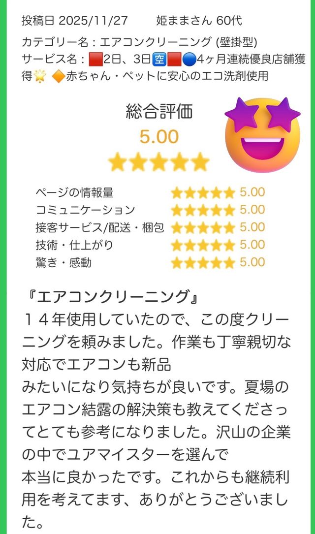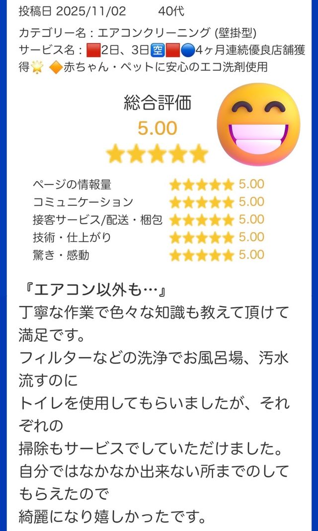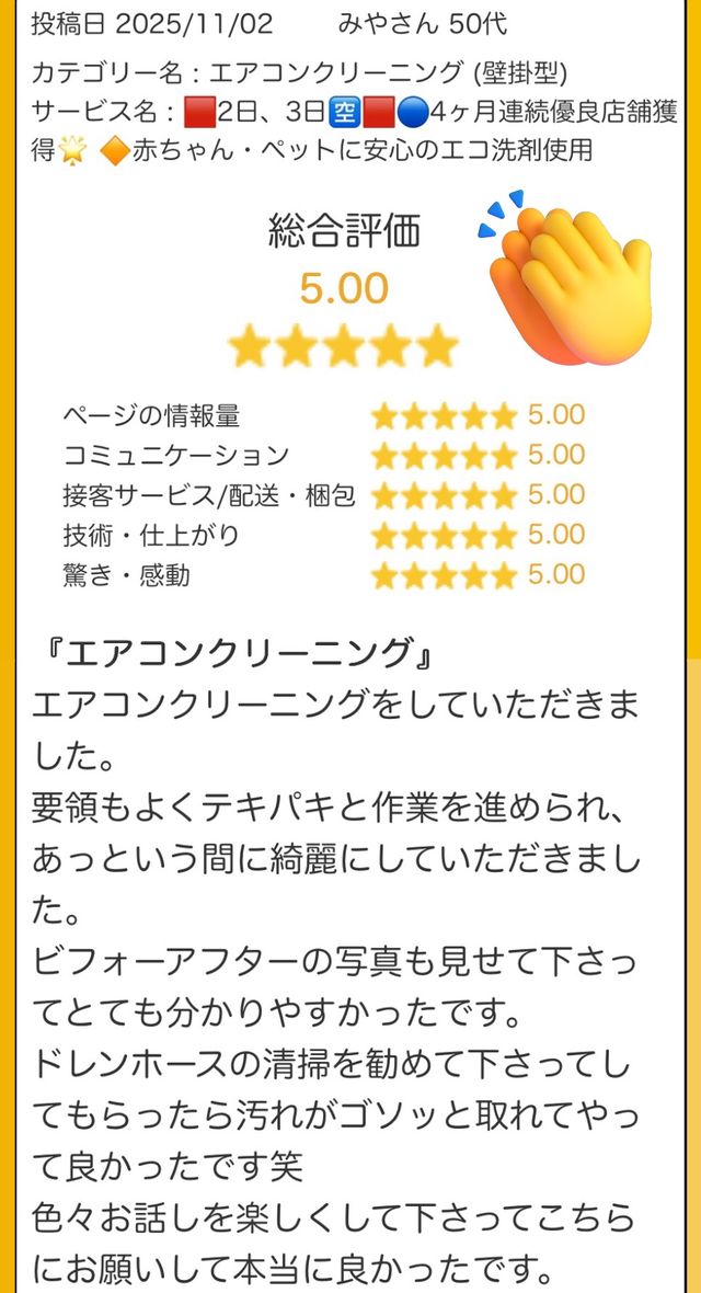 エアコン2台のクリーニングをお願いしました。汚れ具合や今後の対策などその都度説明していただき、安心してお任せすることができました。最後にはお風呂場の換気扇や排水口まで掃除していただいて感動しました。呉本さんありがとうございました。