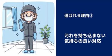 私たちが大切にしているのは「清潔感と接客」。ご自宅に上がるからこそ、スリッパ・手袋・マスクの着用、作業前後の除菌を徹底しています。