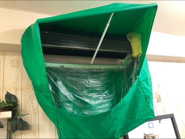 まず、お客様の大切な家具や壁が汚れないよう、エアコンの周囲を専用のシートで丁寧に保護します。