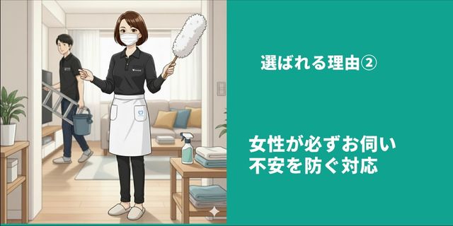 私たちは必ず女性スタッフがお伺いしますので、日中おひとりの主婦の方でも、心から安心してご依頼いただけます。