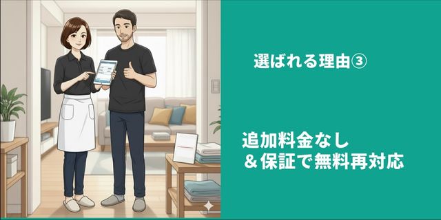 さらに、万が一仕上がりにご満足いただけなかった場合は、責任を持って無償で再対応させていただく「技術保証」もお付けしています。どうぞ、安心してお任せください。