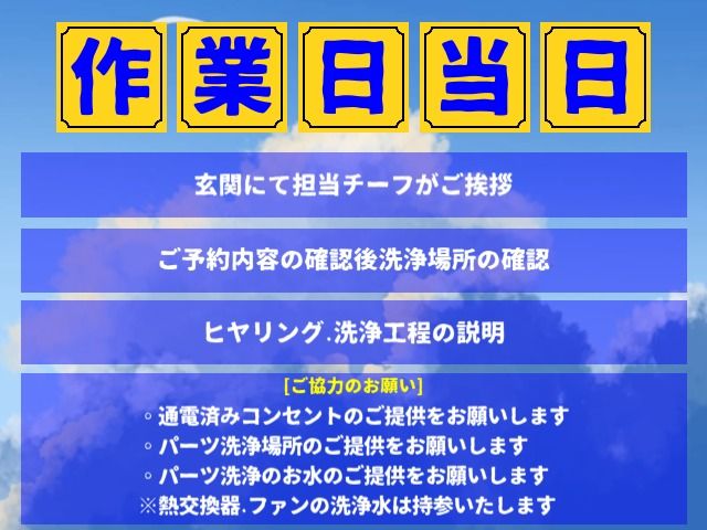 ・お客様ご不在時のサービスは行っておりませんが、作業中の外出は可能です。作業前と作業後には必ずお立合いをお願いしています。