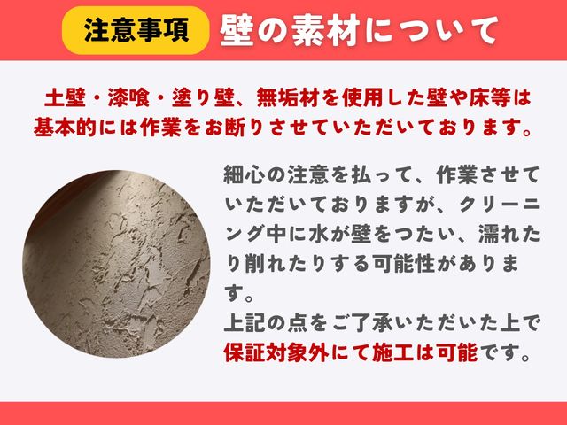 ※土壁、漆喰、塗り壁または無垢材を使用した壁や床などは、クリーニング中に水が壁をつたい、