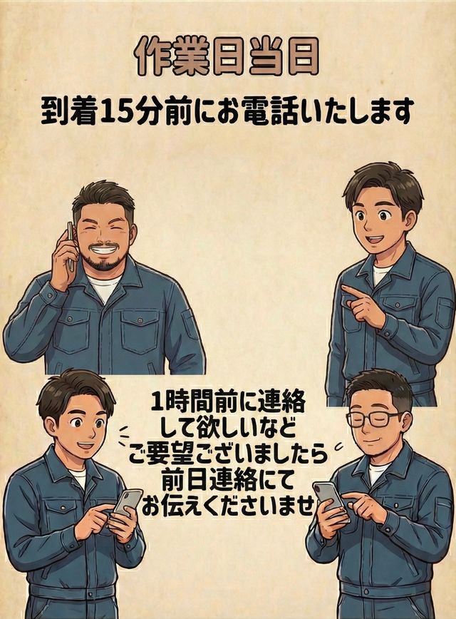 なお、訪問日当日にプロが現場を確認した結果、お客様・プロ双方の事情によらず作業ができない場合は、最低料金として合計料金の50%を頂戴します。