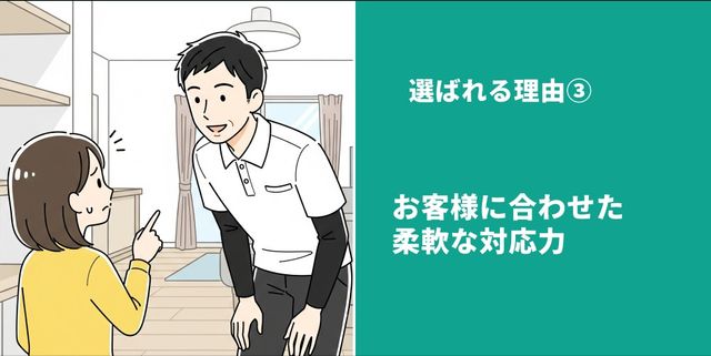 非喫煙者ですので、その点もご安心ください。お客様との対話を大切に、ご家族が安心して過ごせる快適な空間作りを、心を込めてお手伝いします。