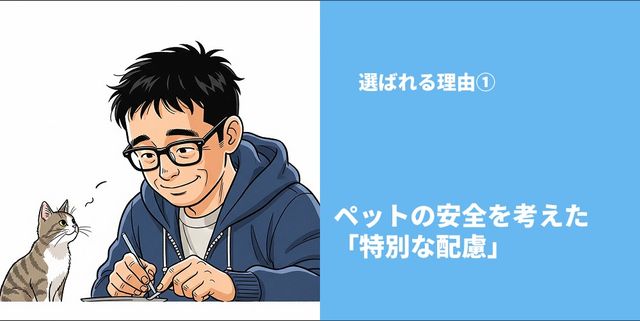 作業中はペットの安全を最優先に考え、ストレスを与えないよう工夫いたします。