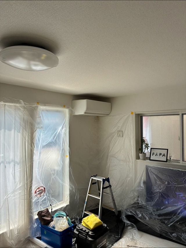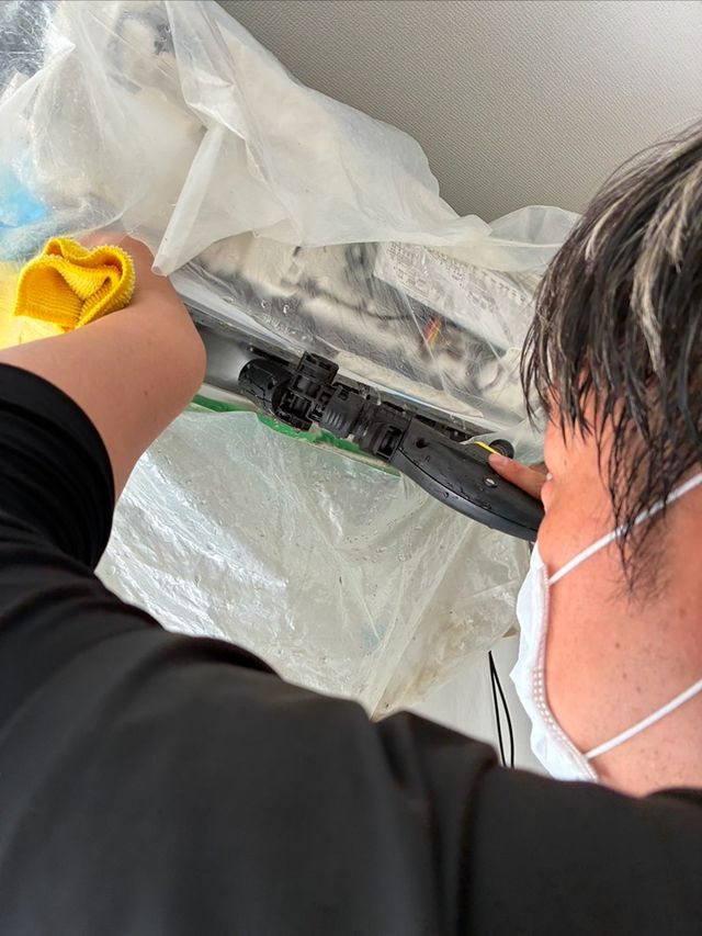 まず、お客様の大切な家具や壁が汚れないよう、エアコンの周囲を専用のシートで丁寧に保護します。