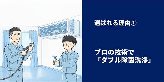 エアコン専用の除菌剤入り洗浄剤で奥の汚れまでしっかり浸透。さらに、除菌剤入りリンスで仕上げる“ダブル除菌”方式を採用しています。カビや臭いの原因を根本から洗い流し、清潔な風をお届けします。