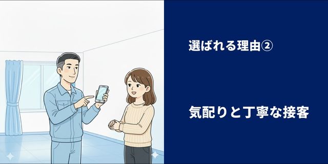 お客様のご自宅に上がる際は、スリッパを履き、道具を床に直置きしないなど、細やかな配慮を欠かしません。作業前に要望を確認し、終了後には仕上がりを一緒にチェック。笑顔で元気よく、気持ちの良い対応を心がけています。