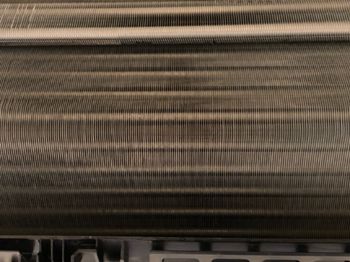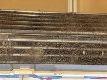 例えばこんな状況のアルミフィン(熱交換器)は風の吸い込みを悪くしています。洗浄する事で、元通りの風を感じてください。
