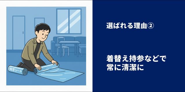 現場ごとに靴下や作業着を替え、常に清潔な状態で伺います。