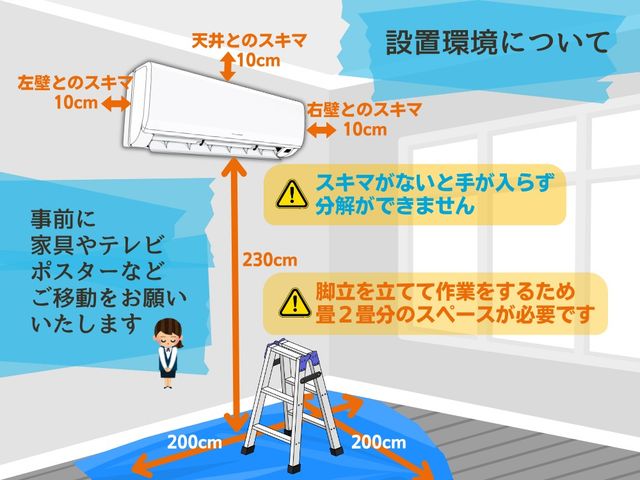 作業をお願いするエアコンの下に、テレビやソファーなどの家具があるのですが、それでも作業は可能ですか?事前に動かしておく必要がありますか?