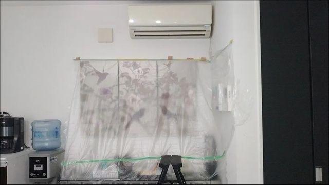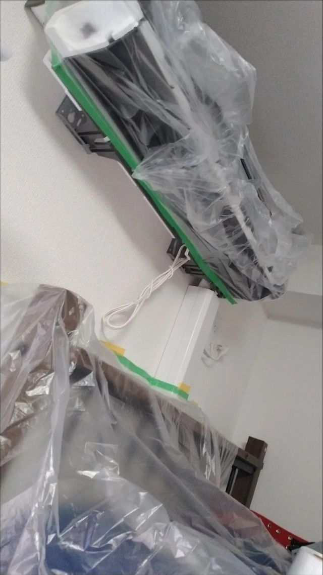 まず、お客様の大切な家具や壁が汚れないよう、エアコンの周囲を専用のシートで丁寧に保護します。