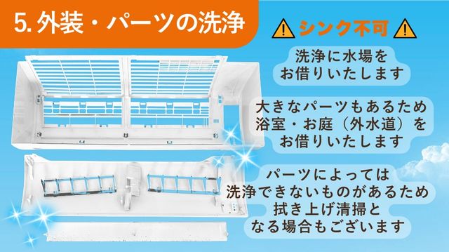 エアコンクリーニングの際に、分解したエアコンの部品は、どこで洗浄しますか?お風呂場を使ったりしますか?