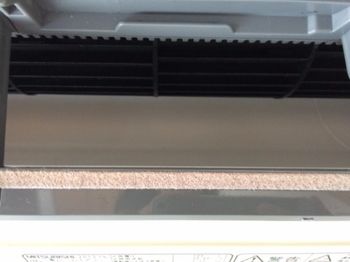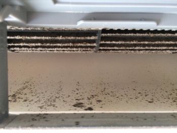 エアコン吹き出し口のファンへも、結露による水分により、ホコリが付着し固まっています…。