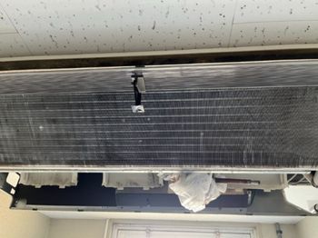 こちらはホテル廊下に設置されている天井吊下げタイプの業務用エアコンです。環境的にあまり汚れないとオーナー様はおしゃっておりましたが、中はかなり汚れておりました。熱交換部分は黒く変色しております。