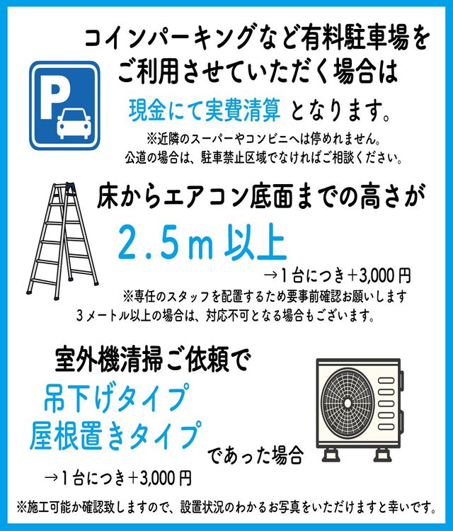 ・エアコンまでの高さが2.5メートル以上ある場合は+3,000円が発生いたします。