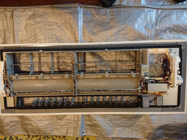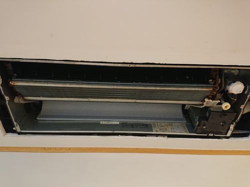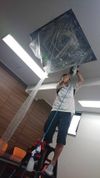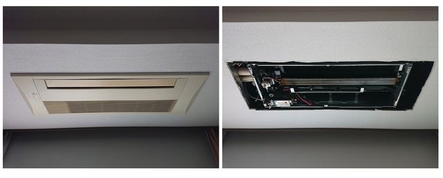 長年放置し清掃が忘れられがちな天井埋込エアコン。当店で分解洗浄お任せください。飲食店・工場の油汚れにも対応
