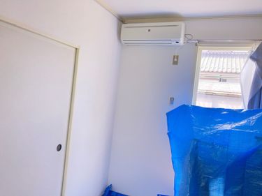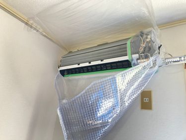作業中の汚れがエアコンの周りの壁や、床に飛び散らないよう、作業現場の周りをビニールで覆って保護します。