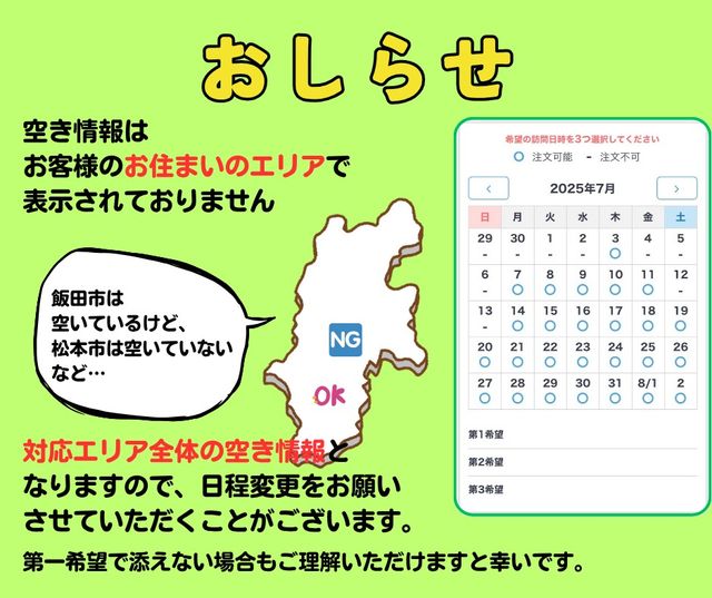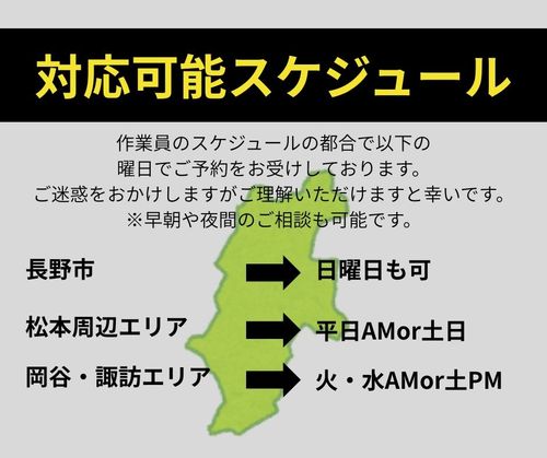 地域によってはお伺いが難しくお断りをさせていただくこともございますが、まずはご相談ください。 作業内容の大小や出張費の相談など可能でしたらお受けしやすいです。