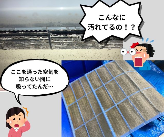 あのカビやホコリ、実は家庭用洗剤ではなかなか落とせません。頑張っても取れない汚れ、そのままにしておくと、エアコンの効きが悪くなったり、ご家族の健康に影響したりすることも。
