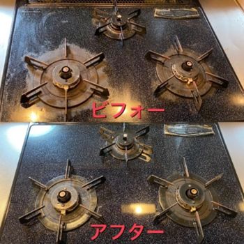 ガスコンロ部のビフォーアフターです。 ピカピカになりました。