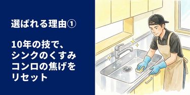 諦めていた水垢や油汚れも、素材を傷つけずにピカピカにします。 毎日使うキッチンは、シンクの水垢(カルキ汚れ)やコンロ周りの焦げ付きなど、家庭用洗剤では落としきれない汚れが蓄積しやすい場所です。私は10年の経験と知識を活かし、汚れの種類や素材(ステンレス、人工大理石など)に合わせて最適な道具と洗剤を使い分けます。力任せに擦って傷をつけるようなことは絶対にしません。「プロの技」で素材本来の輝きを取り戻し、お料理をするのが楽しくなるような明るいキッチンへと蘇らせます。
