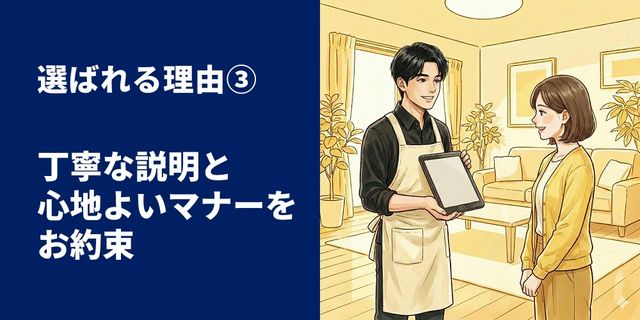 ・お客様ご不在時のサービスは行っておりませんが、作業中の外出は可能です。作業前と作業後には必ずお立合いをお願いしています。